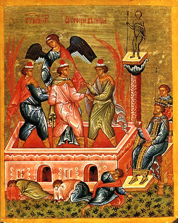 بعد ذلك بزمن نصب نبوخذ نصّر تمثالاً من الذهب وأمر أن يسجد له جميع الناس فأطاعه الخلق كلهم. ولكن وشى الكلدانيون بالفتية الثلاثة إنهم لم يذعنوا. فأرسل الملك في طلبهم غاضباً وهدّد بإلقائهم في وسط أتّون النار المتّقدة إن لم يفعلوا. فأبى الثلاثة أن يسجدوا لغير إلههم وأسلموا لربّهم. إذ ذاك أمر الملك بإحماء النار سبعة أضعاف وإلقاء الثلاثة فيها وهم في سراويلهم وأقمصتهم وأرديتهم وألبستهم. فمن لظى النار احترق الذين أتوا بالثلاثة إلى الأتّون. كان الثلاثة موثقين. وعوض أن تلتهم ألسنة اللهب الفتية نزل ملاك الرب إلى الأتّون وطرد لهيب النار وجعل في وسط الأتّون ما شبه نسيم الندى المنعش فلم تمسّهم النار البتّة، لا هم ولا ألبستهم، فأنشدوا وسبّحوا وباركوا الله.