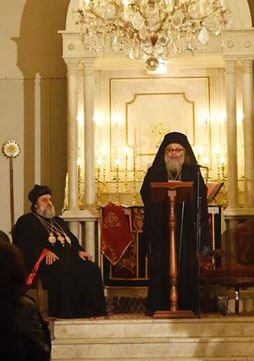 تجمعنا اليوم هذه الصلاة المشتركة مع إخوتنا في الكنيسة السريانية ومع كل أطياف الشرق المسيحي. تجمعنا لنقول أننا نتحد صلاةً من أجل هذا المشرق المعذب، من أجل هذه الأوطان المعذبة والتي من رحم عذابها تستشرف الأمل بالقيامة الأكيدة. تجمعنا الصلاة في مواجهة هذا الظلام الكالح الذي لابد له أن ينجلي من ديارنا بقوة الله وبقوة صبرنا واتكالنا عليه. نحن معكم نعيش أخوّة الإيمان وأخوّة العيش أخوّة الضيق وأخّوة الفرج، أخوّة الراعيين المختطفين يوحنا وبولس والمتّحدين صلاةً معنا ومعكم من أجل عودتهما وعودة كل مخطوفٍ ومن أجل السلام المنشود.