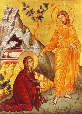 " ولمّا قالت هذا التفتت إلى الوراء، فنظرت يسوع واقفًا، ولم تعلم أنّه يسوع. قال لها يسوع:«يا امرأة، لماذا تبكين؟ من تطلبين؟» فظنّت تلك أنه البستاني، فقالت له: «يا سيّد، إن كنت أنت قد حملته فقل لي أين وضعته، وأنا آخذه». قال لها يسوع:«يا مريم» فالتفتت تلك وقالت له: «ربوني!» الذي تفسيره: يا معلم. قال لها يسوع: «لا تلمسيني لأنّي لم أصعد بعد إلى أبي. ولكن اذهبي إلى اخوتي وقولي لهم: إني أصعد إلى أبي وأبيكم وإلهي وإلهكم» (يوحنا ١٤:٢٠-١٧).