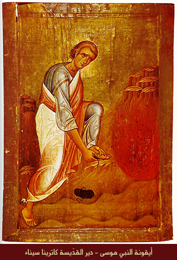 - نرى النبيّ موسى في هذه الأيقونة شابًا، وهو يقوم بخلع حذائه بناءً لطلب الله:" فقال (الله) لا تقترب الى ههنا. إخلع حذائك من رجليك لأن الموضع الذي أنت واقف عليه أرض مقدّسة " (خر5:3)