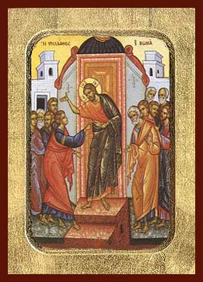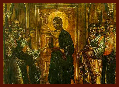 باليمين الوادّة التفتيش أيها المسيح الإله، فتش توما جنبك الواهب الحياة، لأنك حين دخلت والأبواب مغلقة، هتف إليك مع بقية التلاميذ صارخاً: أنت ربي وإلهي