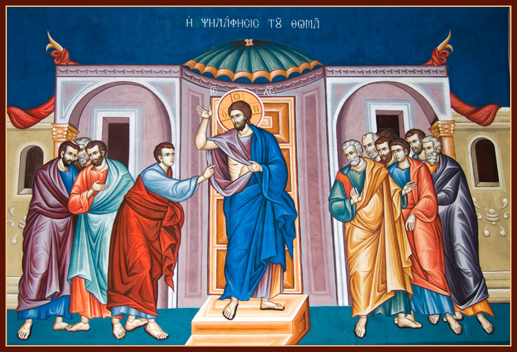 وأما عن أمر توما فهكذا كان: إن المسيح في عشية اليوم الذي قام فيه وظهر للتلاميذ كان توما غائباً، ولم يكن مجتمعاً مع البقية، لأجل خوف اليهود. فلما حضر عند التلاميذ بعد قليل وعرَّفوه بحضور المسيح بينهم وقيامته. فليس انه ما صدّق التلاميذ فقط، بأنهم أبصروه ناهضاً، بل ولا صدّق بالجملة أن المسيح قام. وتوما هذا كان أحد الاثني عشر. أما الإله الحسن التدبير، فاعتنى بهذا التلميذ وأشفق عليه. وأيضاً دبّر تدبيراً أعظم لتحقيق قيامته عند الواردين بعد ذلك بأوفر تصديق. فتركه ثمانية أيام، لكي يهيَّج شوقه للغاية ولكي بتشكيكه يمنح الكل إيماناً بالغاً في الاستقصاء ويثبّت صدق القيامة. ثم جاء أيضاً، كما جاء أولاً، والأبواب مغلقة ودخل وكان حاضراً وأعطاهم السلام كعادته. ثم امتدَّ بالخطاب نحو توما وقال: هات إصبعك إلى ههنا. وانظر إلى يديَّ وهاتِ يدك وضعها في جنبي ولا تكن غير مؤمن، بل مؤمناً. لأنك إذ لم تؤمن بالمشاهدة فقط بتخيُّلك بسبب غلاظة فهمك، ذكرت اللَّمس (فقد أظهر بهذا أنه حينما قال توما هذه الأقوال للتلاميذ، كان يسوع حاضراً يسمع). ويدل بقوله ضعْ يدك في جني ان موضع الجرح الذي في الجنب الشريف، كان يسَع دخول يد. ففتّش توما ببحث وفحص واستمدَّ الإيمان باللَّمس الأنه قد سُمح له أن ينظر إلى هذا ويصنع كل ما يصنع باشتياق، ولئن كان في جسمٍ غير بالٍ ومتألِّه إلى الغاية). فلمّا صدَّق وزال عنه الشك الذي كان قد استحوذ عليه، صرخ: ربي وإلهي. فكان قوله هذا لِمعنَيين: أحدهما لأجل الجسد والآخر لأجل اللاهوت. فقال له الرب: لأنك رأيتني آمنت. طوبى للذين لم يروني ويؤمنون.