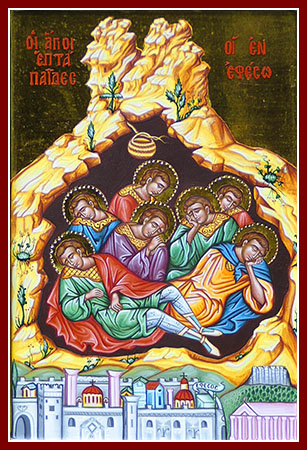 The Seven Youths hid themselves in a certain cave near Ephesus in the year 250, to escape the persecution of Decius. By divine grace, a sleep came upon them and they slept for 184 years, until the reign of Saint Theodosius the Younger, when the doctrine of the resurrection was being assailed by heretics. They then awoke, that is, were resurrected, confirming in the sight of all the bodily resurrection; and again after a short time, by divine command, they reposed in the Lord in the year 434.