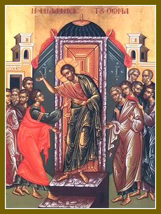 Some icons depicting this event are inscribed “The Doubting Thomas.” This is incorrect. In Greek, the inscription reads, 0 “The Touching of Thomas.” In Slavonic, it says, “The Belief of Thomas.” When St Thomas touched the Life-giving side of the Lord, he no longer had any doubts.