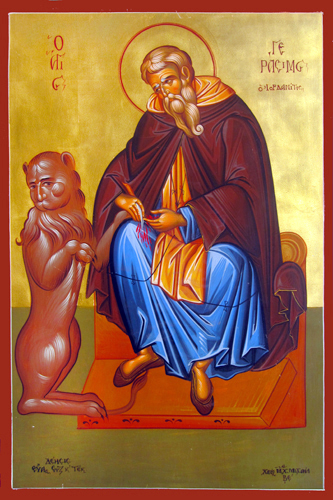4-3 agios-gerasimosPalestine. There he built the great Lavra by the Jordan River, where a lion served him with great obedience and devotion. One day the lion came looking for Gerasimus that he might feed him, but his disciples took the lion to the place where they had buried the Saint shortly before. The lion fell at the Saint's grave and, after roaring with grief, died at that very place. Saint Gerasimus reposed in 475.