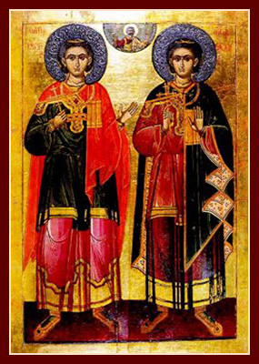 These holy Martyrs were Romans of high rank in the service of the Emperor Maximian, to whom it was reported that they did not take part in the festivals of the idols. When he called them into his presence, they confessed their Faith in the one God. He had them arrayed in women's clothes and paraded through the streets in mockery. They were afterwards scourged, from which Saint Bacchus died. This was about the year 296. Saint Sergius was then taken to Resapha in Syria, where he was tortured and beheaded. His tomb in Resapha became a very famous shrine, to which pilgrims came from as far away as Western Europe; Resapha was later renamed Sergiopolis in his honour.