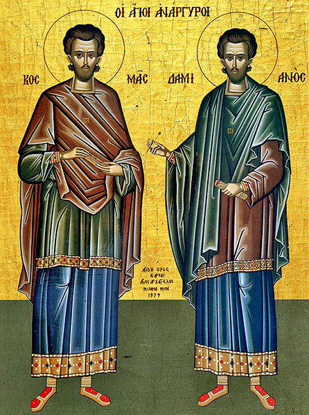 The Unmercenary Saints Cosmas and Damian of Asia Minor should not be confused with the Unmercenary Saints Cosmas and Damian of Rome‭ (‬July 1‭), ‬or the Unmercenary Saints Cosmas and Damian of Arabia‭ (‬October 17‭).‬