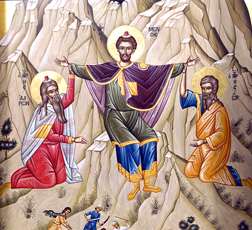 -Here we see Moses standing with his hands stretched out in the form of a cross.
