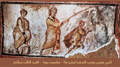 Moses hitting the rock is an early image of the crucifixion of Jesus Christ and His sufferings for our sake; it is also an early image of the lance with which He was stabbed in the side, when water and blood came out.