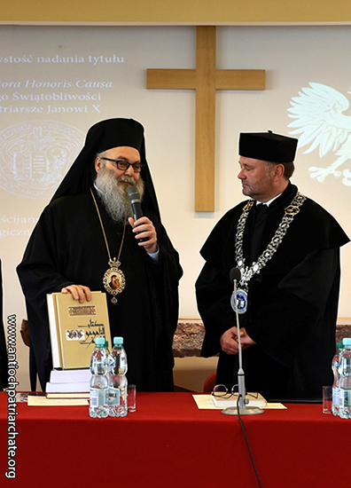 Being the Patriarch of Antioch, the city which engraved in history the name of the School of Antioch, the theological school of exegesis, I am pleased to be with you and in your midst at the Christian Academy of Theology in Warsaw. This Academy’s legacy and the Christian name it bears is the best evidence that the main universities in the world were the walls of churches and monastery yards. This is not in itself a matter of reclusiveness or about rigid Christian thinking. Rather, it is the best evidence that Christianity, despite all the lapses of Christians in history and the present times, is, and ever shall be, the foundation of human civilization for Europe and for many countries. Its first and foremost calling is to supply societies with all of its beauties, values and lights, eliminating all isolationist and takfir ideology, and paving the way for love and openness, and for the confluence of civilizations, not for their struggle.