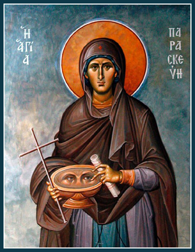 means "preparation" or "preparedness" (compare Matt. 27:62, Mark 15:42, Luke 23:54, and John 19:31, where 'Friday' is called "the day of the preparation"). From childhood she was instructed in the sacred letters and devoted herself to the study of the divine Scriptures, while leading a monastic life and guiding many to the Faith of Christ. During the reign of the Emperor Antoninus Pius, she was apprehended because she was a Christian and was urged to worship the idols, but she answered with the words of Jeremias: "Let the gods that have not made heaven and the earth perish from off the earth" (Jer. 10:11). Because of this she endured exceedingly painful torments, and was beheaded in the year 140. The faithful pray to her for the healing of eye ailments.