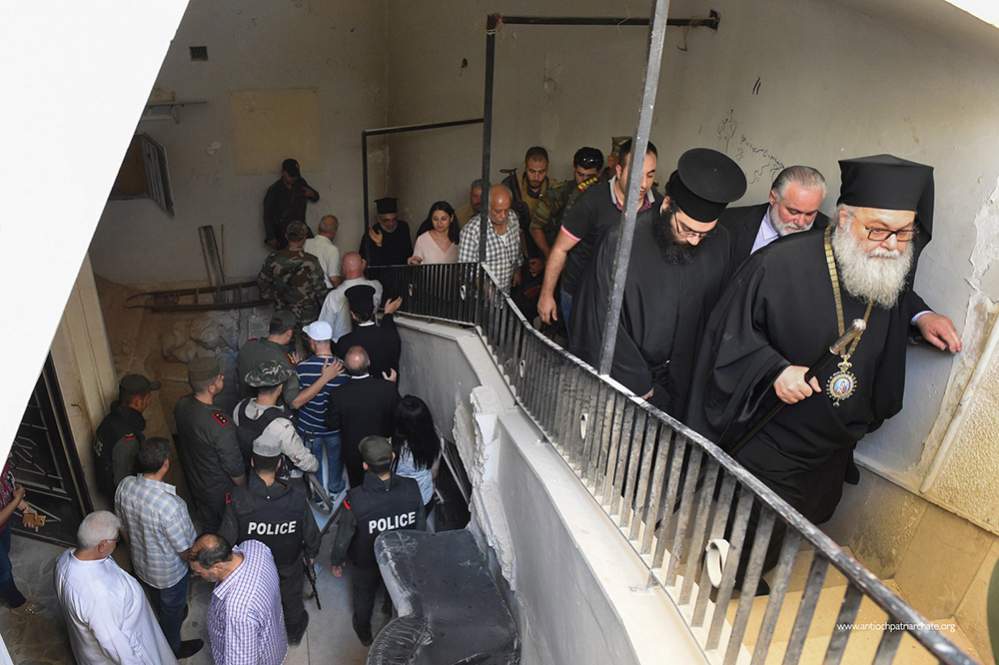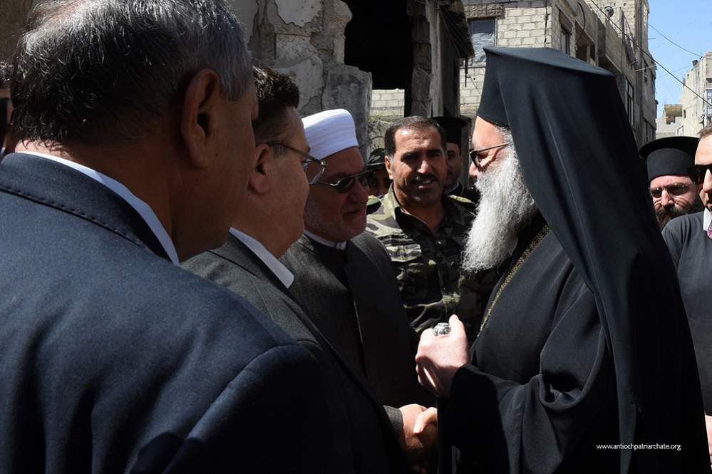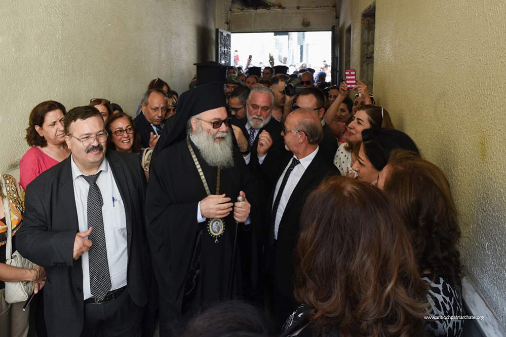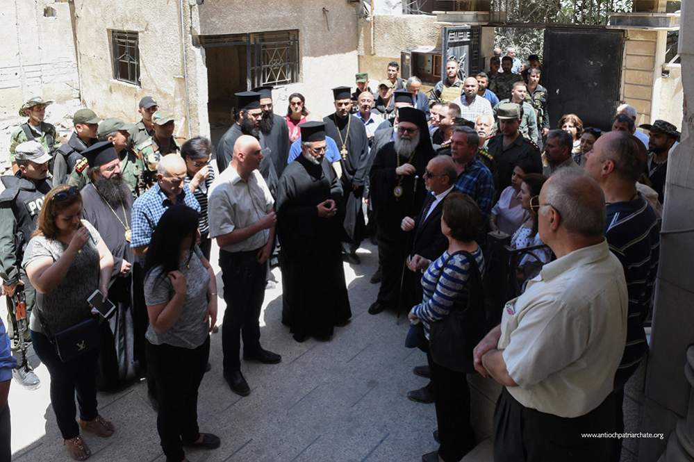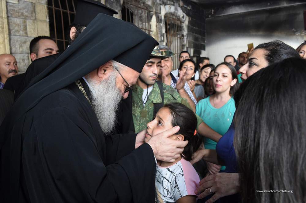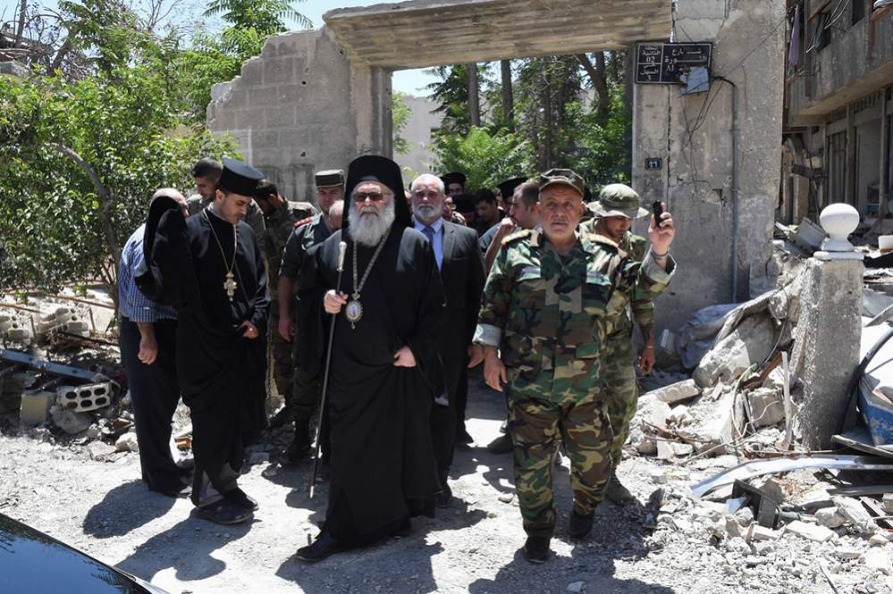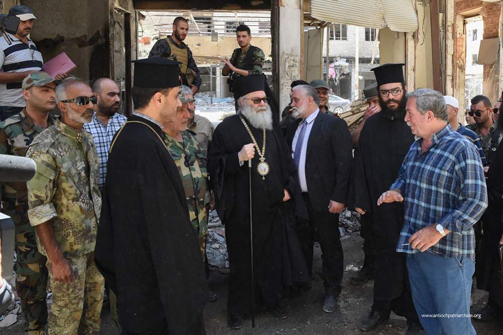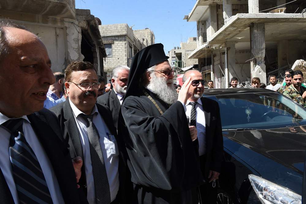البطريرك يوحنا العاشر في زيارة تفقديّة إلى عربين وحرستا في الغوطة الشرقيّة. ٦ تمّوز ٢٠١٨