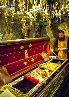 - ‏ومن ذلك أنه خرج مرة إلى كنيسة منعزلة أهملها المؤمنون، وشاء أن يقيم فيها الذبيحة الإلهية. لم يشعل الخدّام في المناسبة إلا مصابيح قليلة لأنهم قالوا لم يحضر من الناس غير أفراد قلائل. ولكن ما إن انطلقت الخدمة حتى بدا أن الحاضرين أكثر بكثير مما كان منظوراً، وجلّهم كان لا من البشر بل من الملائكة. فما أن استدار الأسقف باتجاه الشعب وأعطى السلام: "السلام لجميعكم!" حتى صدحت في الكنيسة أصوات الملائكة مجيبة: "ولروحك أيضاً!". على هذا النحو استمر القداس الإلهي: القديس يؤمّ الخدمة والملائكة تجيب. أمّا قناديل الزيت فامتلأت زيتاً وأضاءت بالأكثر.