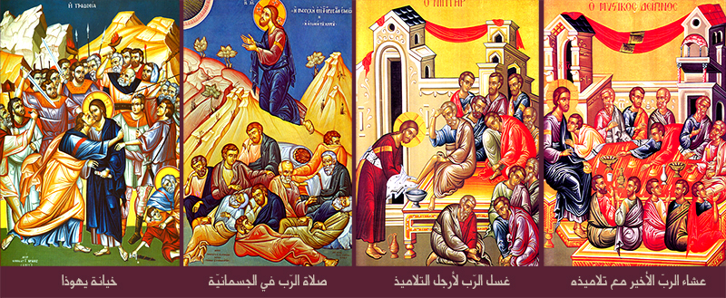 ١- عشاء الربّ الأخير مع تلاميذه. ٢- غسل الرّب لأرجل التلاميذ. ٣- صلاة الرّب في الجسمانيّة. ٤- خيانة يهوذا.