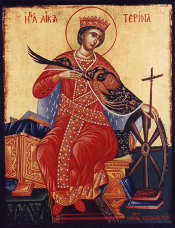 يظهر الى جانب القديسة كاترينا في ايقونتها، "دولاب" و"كرة" و"كتب".
