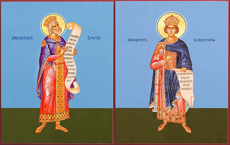 في أَعلى الأيقُونَةِ نُشاهِدُ فِي الزَّاويَتَينِ المَلِكَين دَاوُدَ وسُلَيمَان. دَاوُدُ يَحمِلُ رَايَةً مَكتوبٌ عليها: "مَا أَكْرَمَ أَفْكَارَكَ يَا اَللهُ عِنْدِي! مَا أَكْثَرَ جُمْلَتَهَا!" (مز١٧:١٣٨)، أمَّا في رَايَةِ سُليمانَ المَلِكِ فتَظهَرُ آياتٌ مِن سِفرِ الحِكمَة:" أَمَّا نُفُوسُ الصِّدِّيقِينَ فَهِيَ بِيَدِ اللهِ، فَلاَ يَمَسُّهَا الْعَذَابُ" (حك ١:٣) و"فَهُم فِي وَقْتِ افْتِقَادِهِمْ يَتَلأْلأُونَ، وَيَسْعَوْنَ سَعْيَ الشَّرَارِ بَيْنَ الْقَصَبِ" (حك٧:٣). كذلك "أَمَّا الصِّدِّيقُونَ فَسَيَحْيَوْنَ إِلَى الأَبَدِ، وَعِنْدَ الرَّبِّ ثَوَابُهُمْ" (حك١٦:٥).![]()