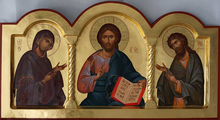 نلاحظ في الوسط تمامًا وفي خط أفقيّ وجود والدة الإله عن يمين الرّب يسوع المسيح، والقدّيس يوحنا المعمدان عن يساره. إنّهما في حالة تضرّع وتوسّل وصلاة.
