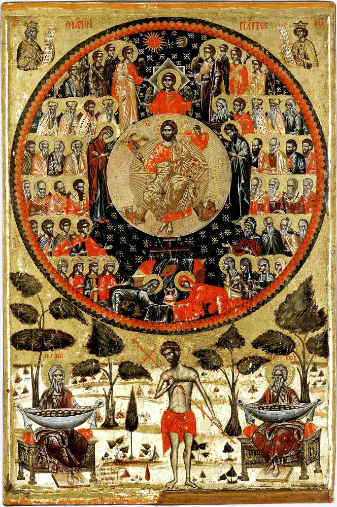يَتَوزَّعُ القِدِّيسُونَ فِي صُفوفٍ: الشُّهدَاءُ، النُّسَاكُ، الآبَاءُ، الرُّسُل. تَجِبُ الإشَارَةُ إلى أنَّ عَدَدَ القِدِّيسينَ غَيرُ مَحدُود.