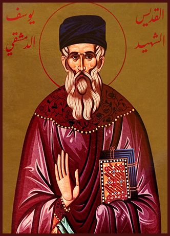 On the tenth of this month we commemorate the Holy Hieromartyr Yousef ibn Jirjis Mousa ibn Mouhana al-Haddad and his Companions. A married man, St. Joseph of Damascus, as he is popularly known, was at first a weaver and then was ordained to the holy priesthood at the age of twenty-four in 1817, and assigned Great Economos of the Patriarchal Cathedral of the Dormition of the Most Holy Theotokos (al-Mariamiyeh) in the heart of the Old City of Damascus.On Monday, July 9th, 1860 the brutal massacre of Christians, which began in the mountains of Lebanon, spread to Damascus. Some Damascenes (including Michael Hawaweeny and his young wife Mariam who was